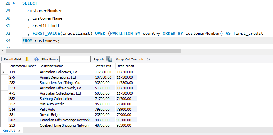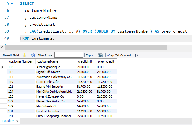 , LAG(creditLimit, 1, 0) OVER (ORDER BY customerNumber) AS prev_credit