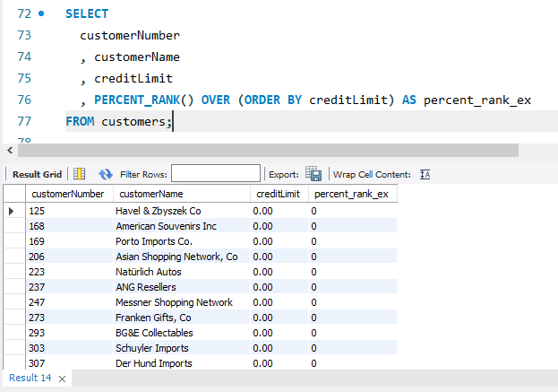 , PERCENT_RANK() OVER (ORDER BY creditLimit) AS percent_rank_ex