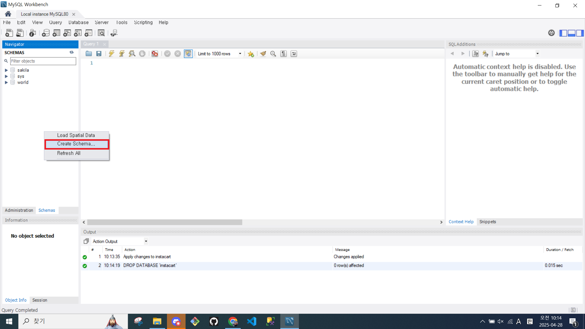 MySQL Workbench 실행 후, 좌측 Navigator - Schemas 창 우클릭, Create Schema... 버튼을 클릭