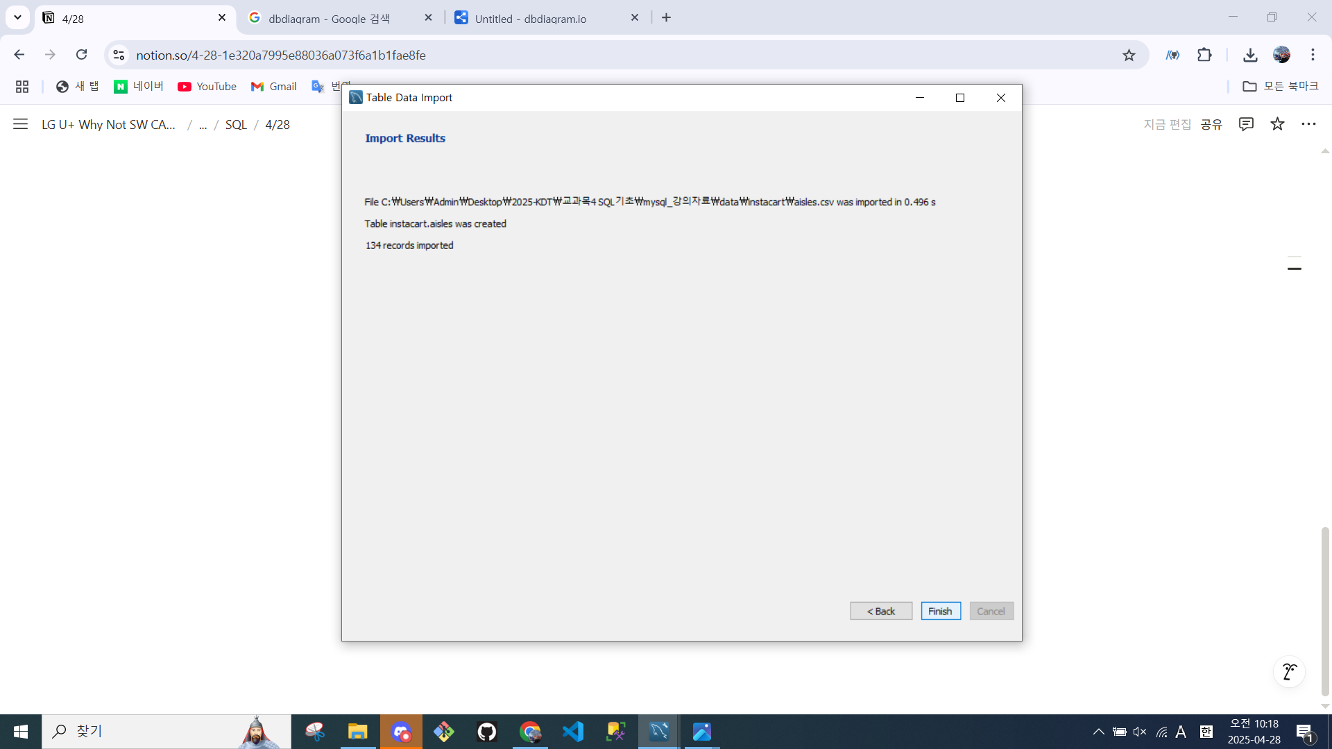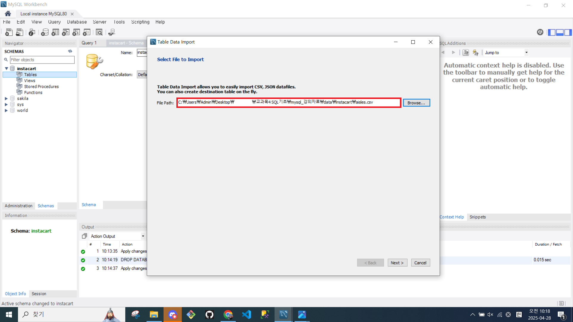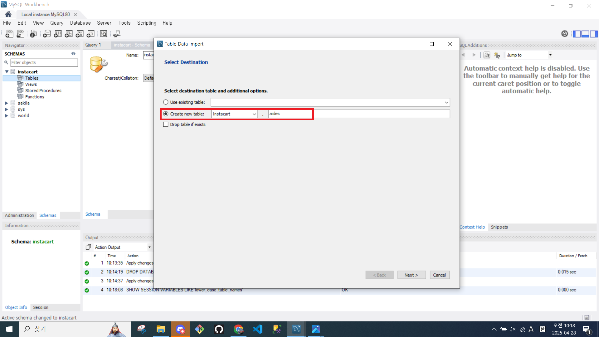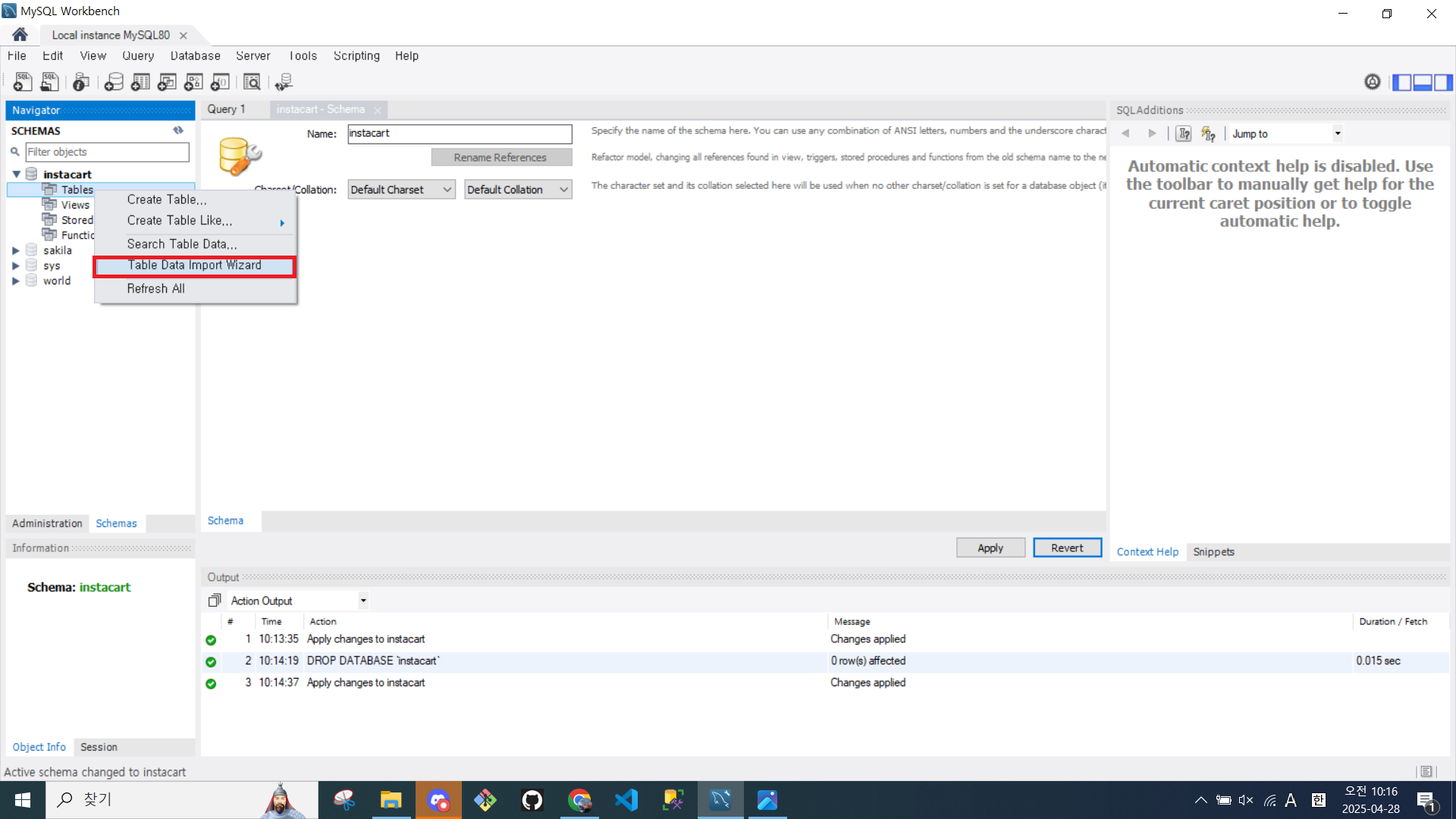 좌측 Navigator - Schemas 창에서 테이블을 생성할 스키마의 테이블을 우클릭 후, Table Data Import Wizard 버튼 클릭