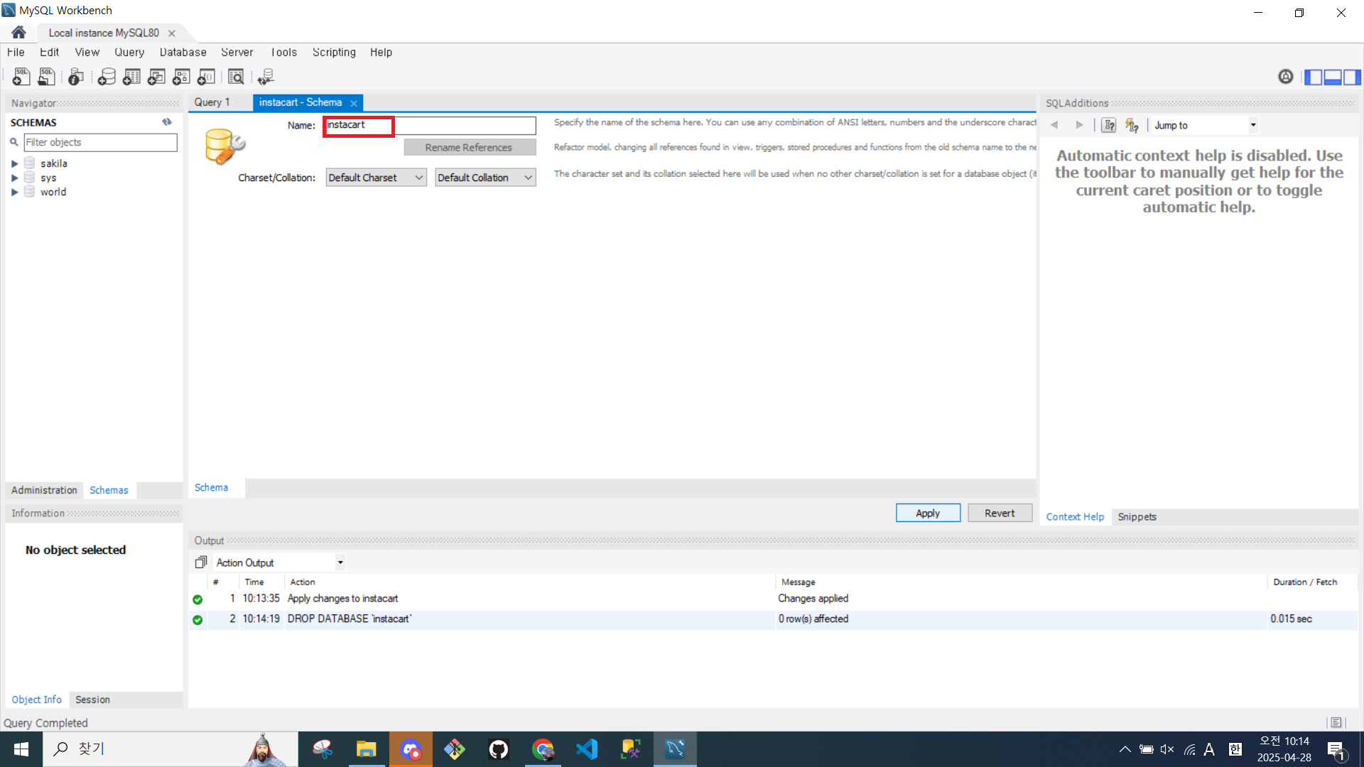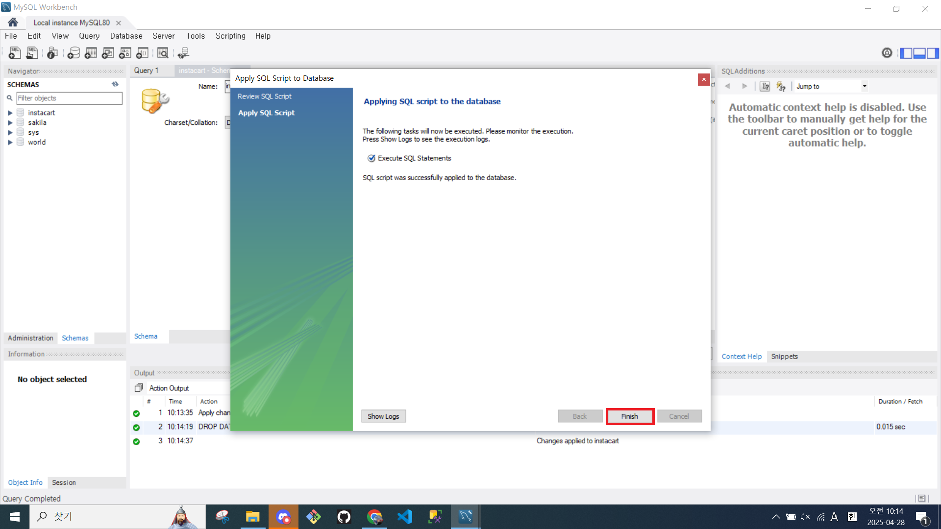 스키마 생성 스크립트 확인 후, Apply 클릭