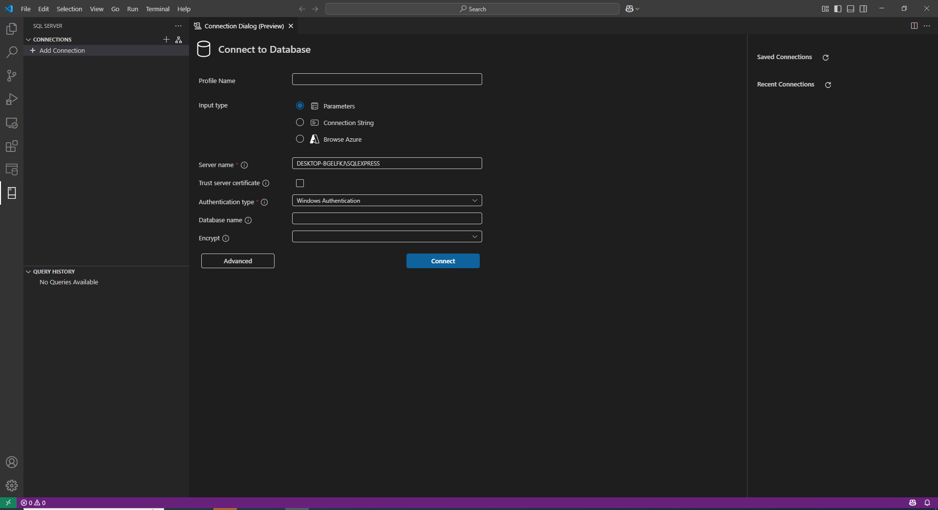 왼쪽 사이드바 SQL Server 클릭 → CONNECTIONS → Add Connections 클릭