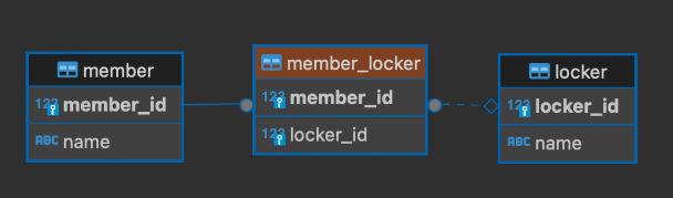 연관 관계를 관리하는 조인 테이블(member_locker)을 추가하고 여기서 두 테이블의 외래 키를 관리한다.