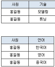 기술과 언어는 한 사원에 속해 간접적 연관 관계는 있지만, 업무 요건상 직접적인 관계가 없기 때문에 두 릴레이션으로 분해한다.