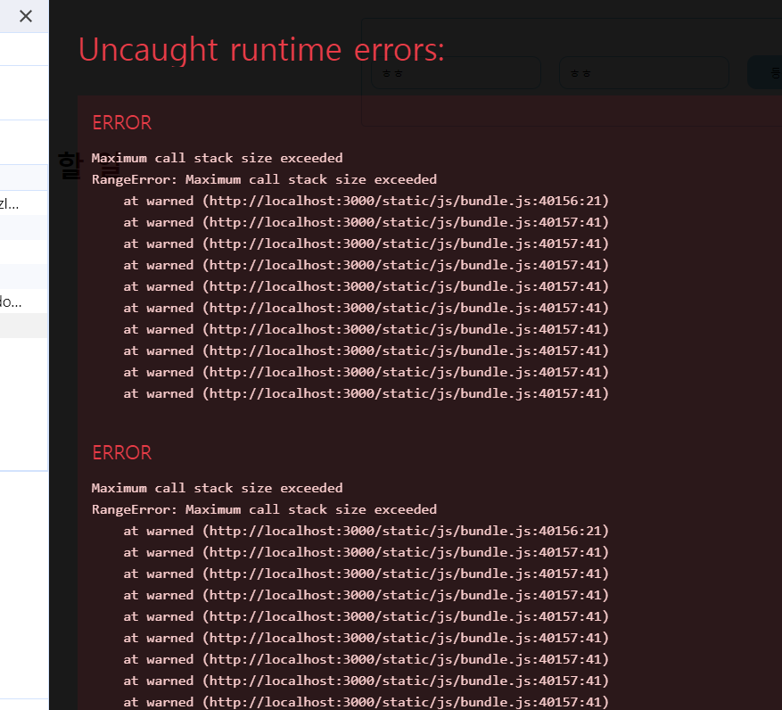 react로 todolist를 만드는데 에러가 났다. 재귀함수가 호출돼서 발생되는 에러라는데..내 코드에는 아무리봐도 재귀함수가 안보였다. 좀 더 깊게 살펴보니 호출 스택에 허용된 것보다 더 많은 함수가 있는 경우 최대 호출 스택 크기 초과 오류가 발생하는 것이었다.