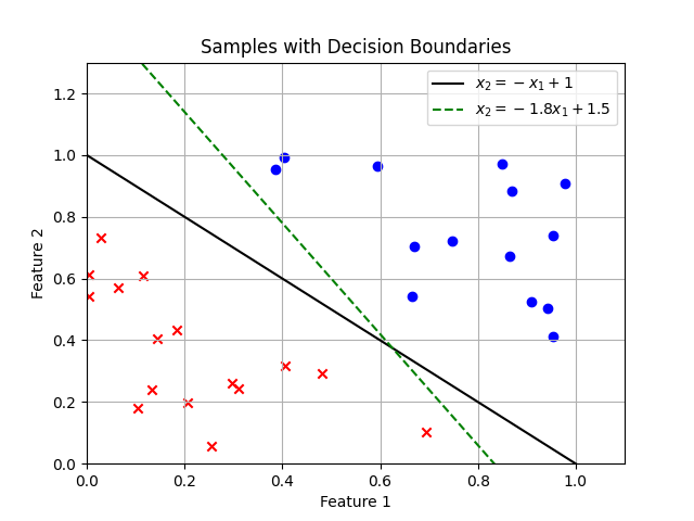 이와 같이 완벽히 구분 가능한 문제의 경우, 마진을 통해 분류기의 성능을 비교할 수 있다.