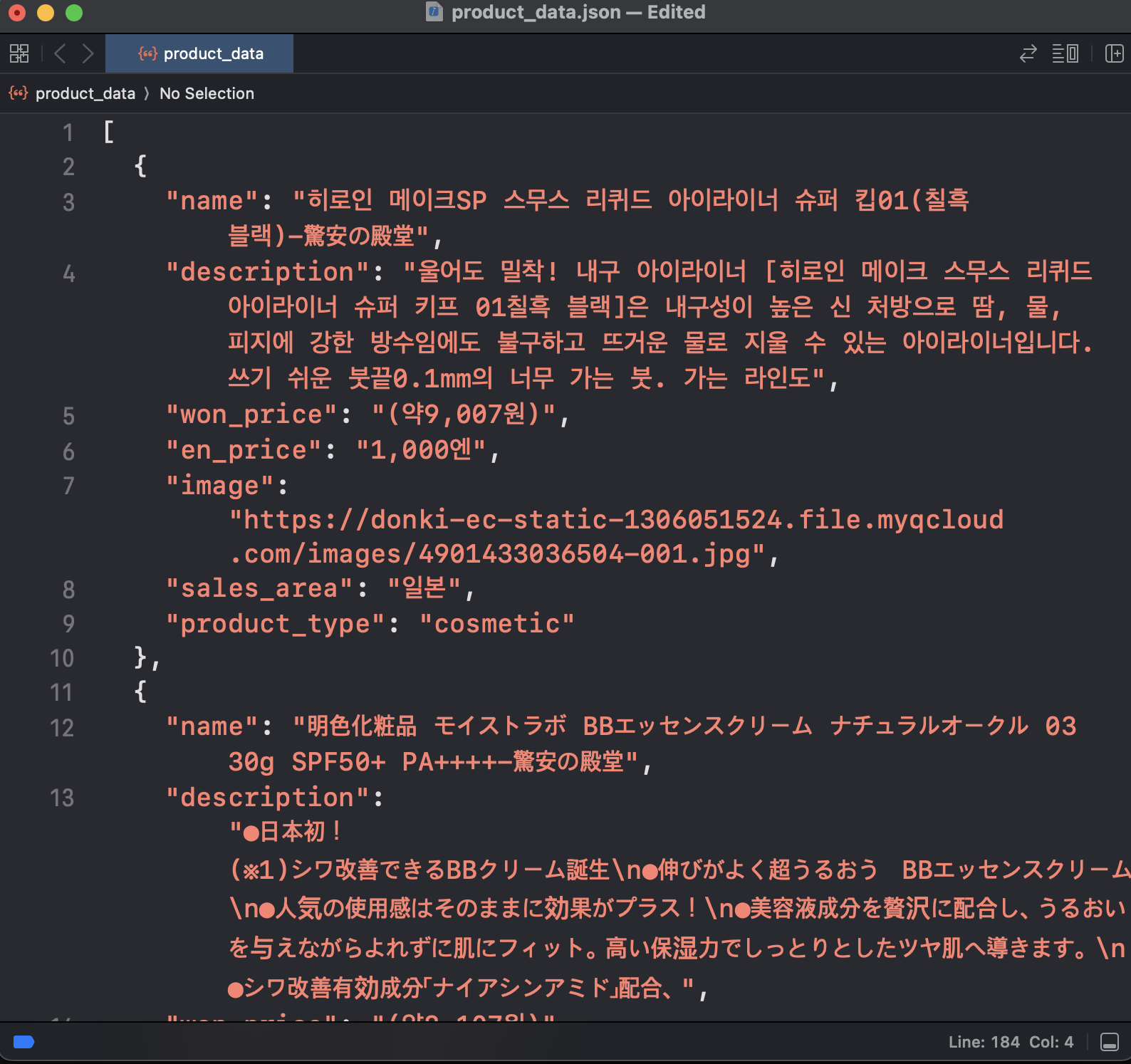 다행히 팀원 한 분이 고생해주신 덕에 돈키호테라는 사이트에서 상품 정보를 크롤링 해 올 수는 있었는데, 문제는 그 json 파일을 db에 넣는 것이었다.