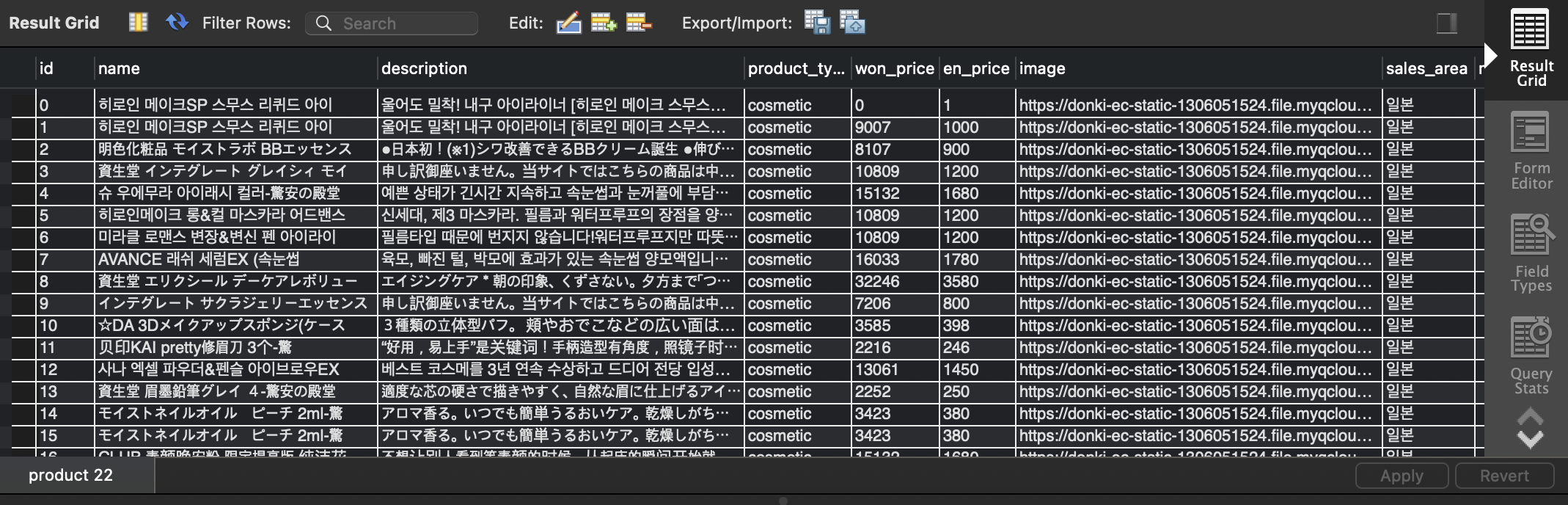 return `(${index + 1}, '${product.name}', '${product.description}', ${parseInt(product.won_price.replace(/[^0-9]/g, ''))}, ${parseInt(product.en_price.replace(/[^0-9]/g, ''))}, '${product.image}', '${product.sales_area}', '${product.product_type}')`;