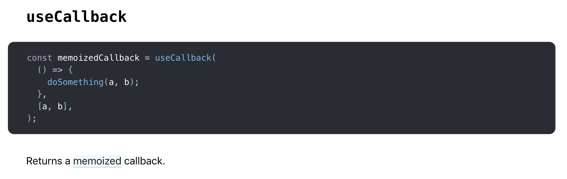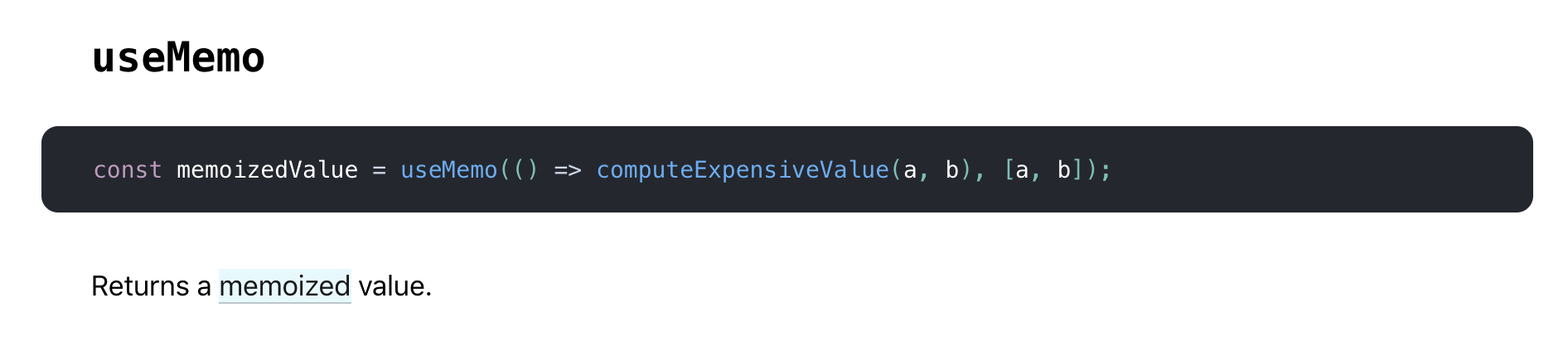 메모리제이션된 값을 반환한다라는 문장이 핵심이다. 다음과 같은 상황을 상상해보자. 하위 컴포넌는 상위 컴포넌트로부터 a와 b라는 두 개의 props를 전달 받는다. 하위 컴포넌트에서는 a와 b를 전달 받으면 서로 다른 함수로 각각의 값을 가공(또는 계산)한 새로운 값을 보여주는 역할을 한다. 하위 컴포넌트는 props로 넘겨 받는 인자가 하나라도 변경될 때마다 렌더링되는데, props.a 만 변경 되었을 때 이전과 같은 값인 props.b도 다시 함수를 호출해서 재계산해야 할까? 그냥 이전에 계산된 값을 쓰면 되는데!