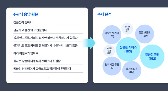 으로 분석하기 때문에 응답에 대한 세부적인 의미, 맥락을 파악하기 어렵다.주제 분석은 단어나 문장의 패턴을 분석해 공통적인 주제를 도출하는 데이터 시각화 방법