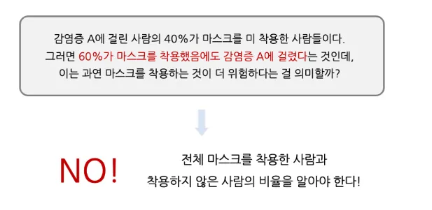 ※ 마스크 쓸 때보다 마스크를 쓰지 않을 대 감염증 A에 걸릴 확률이 6배 높다.