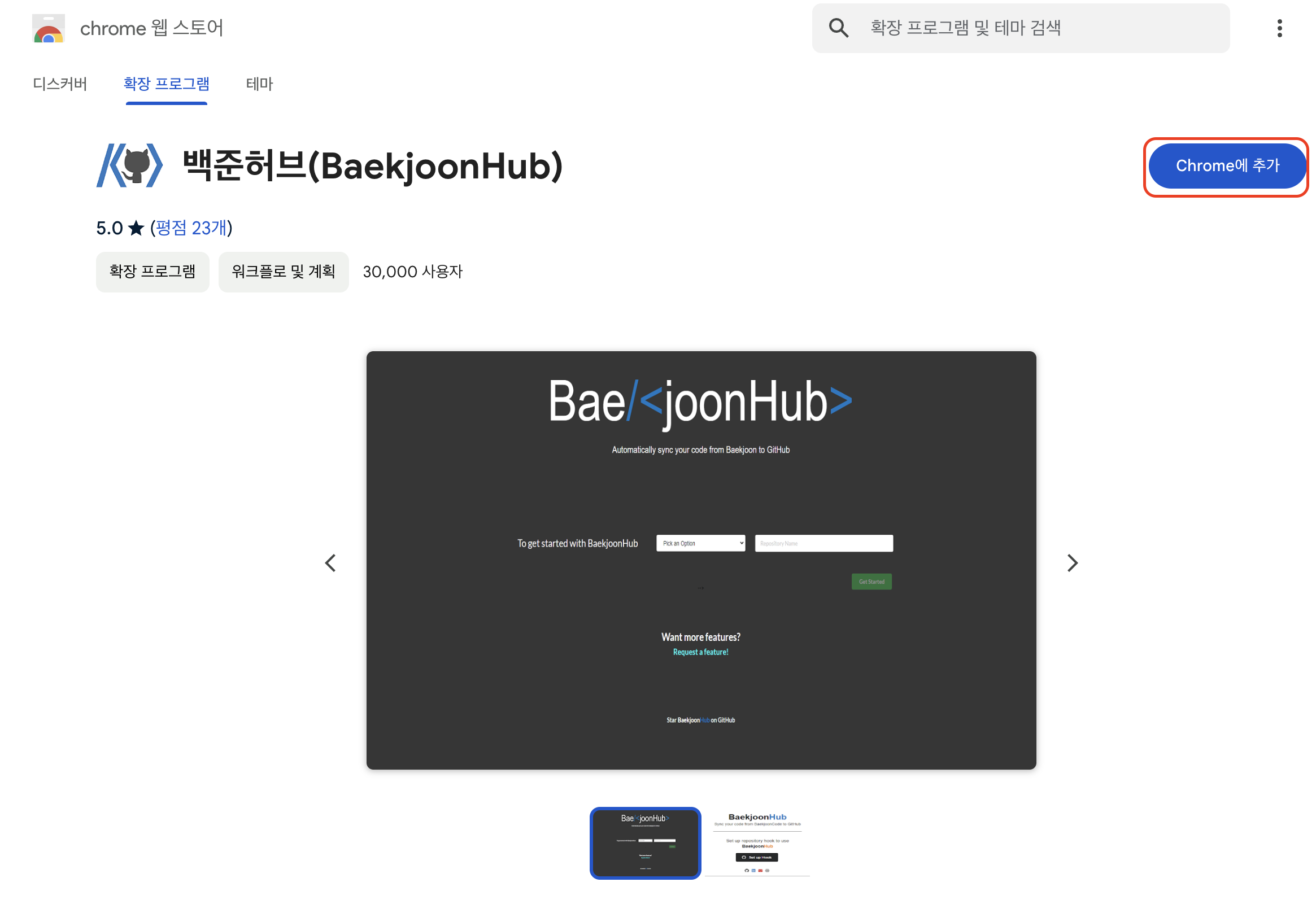 빨간 박스의 백준 허브 클릭