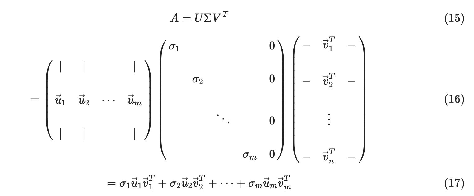 - 어떤 행렬을 직교행렬 diagonal Matrix 직교행렬로 표현할 수 있고, 중간의 diagonal Matrix가 결국 표현할 수 있는 정보량을 의미하기 때문에, 이게 결국 차원 축소에 활용할 수 있게 됨.(유사한 개념으로 고유값 분해가 있는데, 계산과 전제 조건이 어려워서 실제 활용하기 쉽지 않다.)