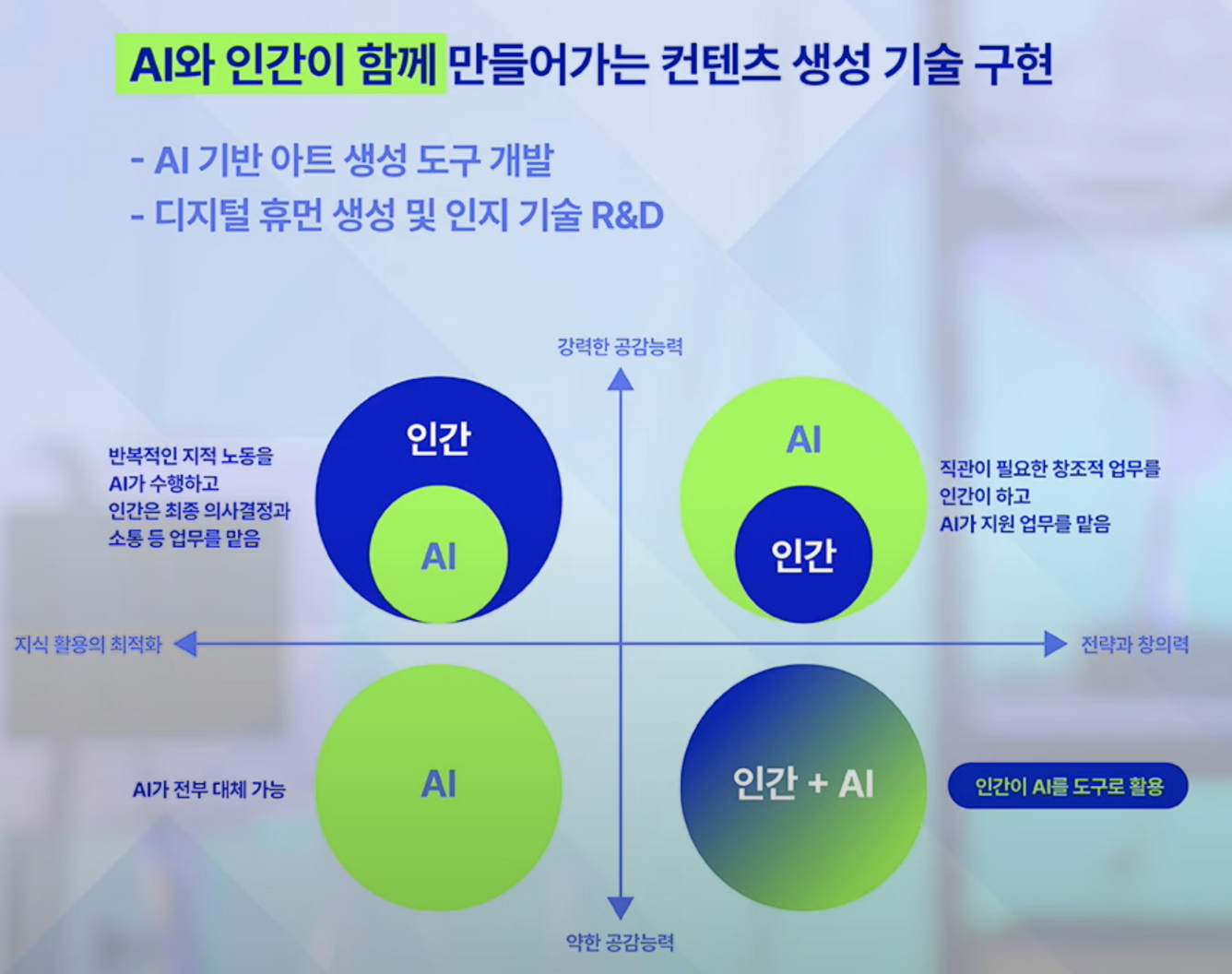 - 관심있는 분야인 컨텐츠 생성툴에서의 AI 적용에 대해서도 간략하게나마 배울 수 있었다. 아래 도표는 재밌는 관점인것 같아서 첨부