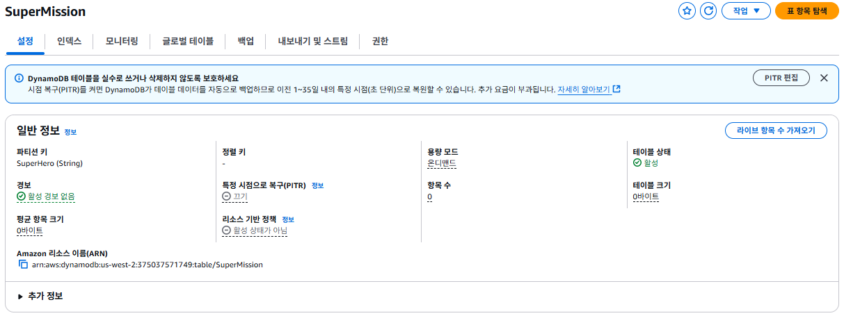 우선 정보를 저장할 DynamoDB 테이블(SuperMission)을 생성해, 이후 데이터 저장 및 조회의 기반을 마련합니다.