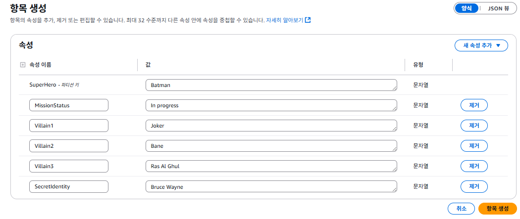 JSON 편집기는 DynamoDB 항목의 구조를 명확하게 정의하고, 빠르게 여러 속성을 입력할 수 있는 방법입니다.