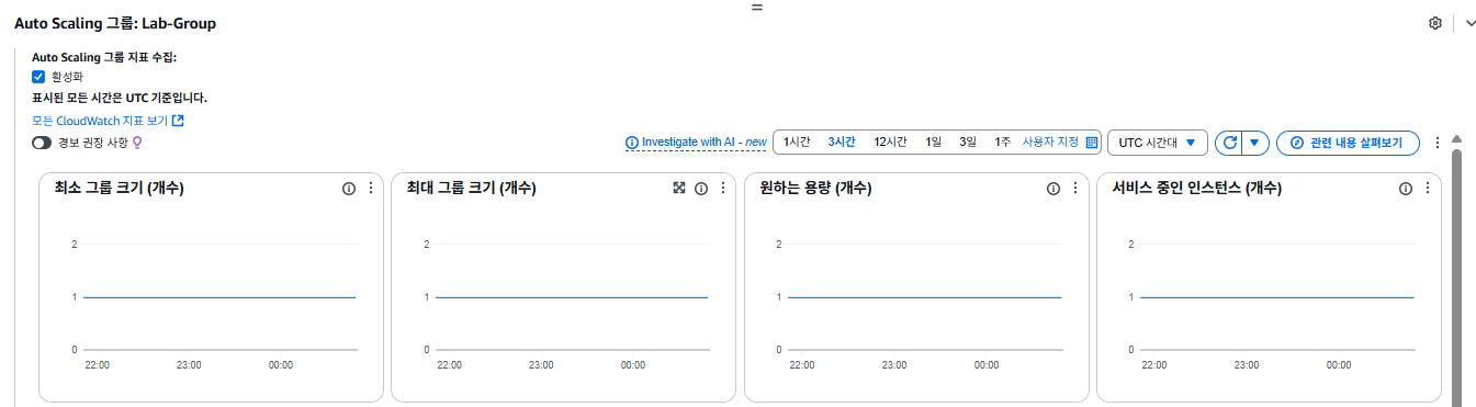 그룹의 최소 인스턴스 수가 1개로 설정된 상황에서, 인스턴스를 수동으로 종료하면 Auto Scaling이 이를 인식하고 즉시 새 인스턴스를 자동으로 시작하는지를 확인합니다.