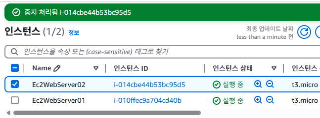 인스턴스를 의도적으로 중지하면, 로드 밸런서의 헬스 체크(Health Check)가 비정상 상태를 감지합니다.
