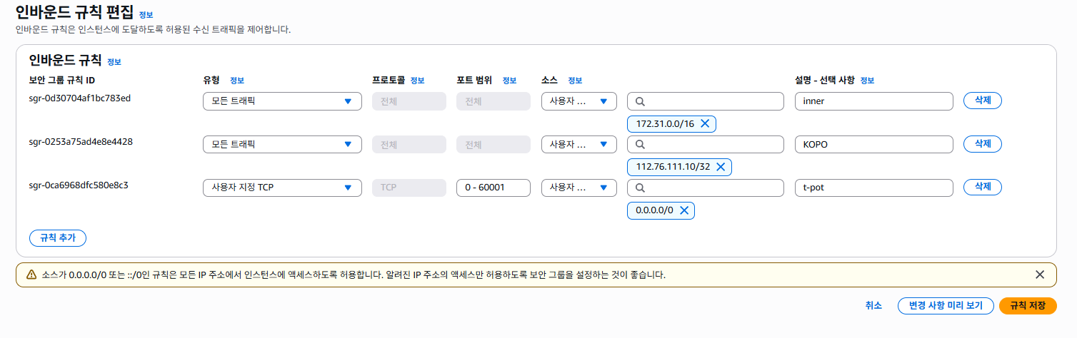 TCP: 포트 0~60001 전체 허용 (테스트/실습용)