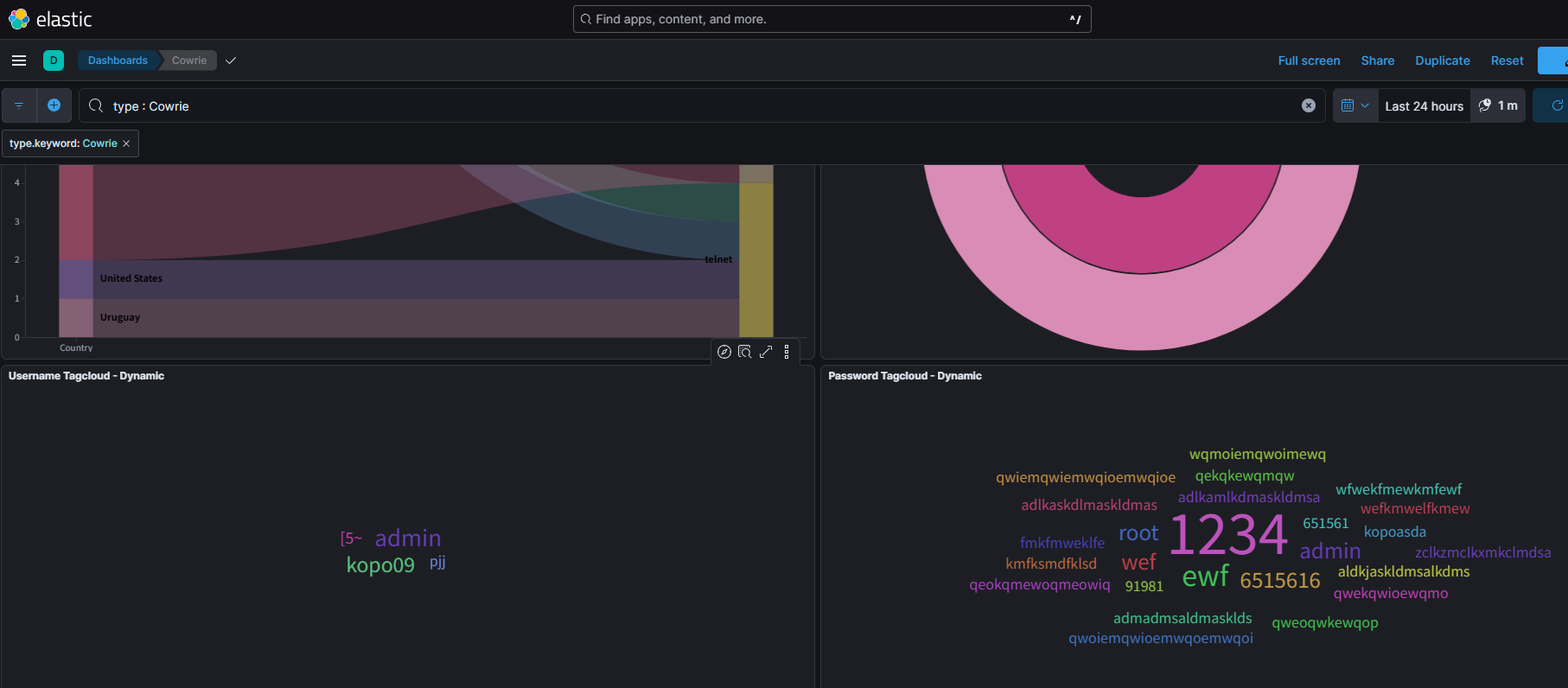 Cowrie 로그는 Elasticsearch나 Kibana 같은 도구를 통해 검색할 수 있으며, cowrie라는 키워드로 필터링하면 어떤 ID와 패스워드가 시도되었는지를 확인할 수 있다. 실습 환경에서 공격자 분석, 계정 탈취 시도 추적, 자동화된 브루트포스 탐지 실습까지 가능하다