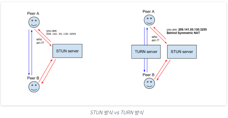 - STUN (Session Traversal Utilities for NAT): NAT(Network Address Translation) 환경에서도 통신이 가능하도록 합니다.