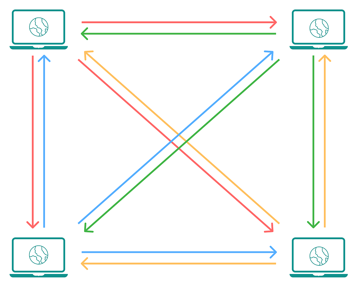 - 개념: 모든 클라이언트가 서로 직접 연결되어, 각 클라이언트가 다른 모든 클라이언트와 P2P 방식으로 미디어를 주고받는 방식입니다.