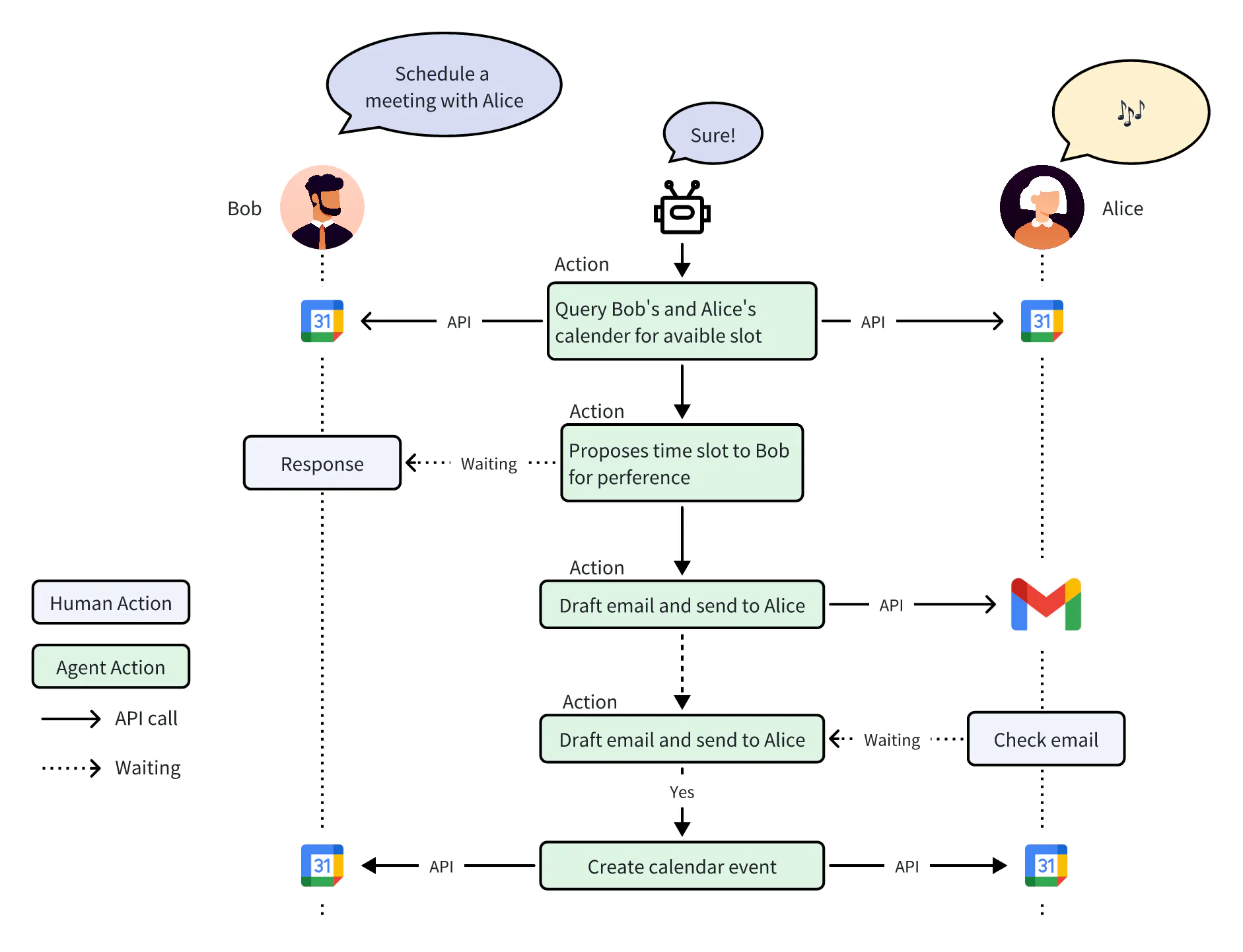 이해관계자 간의 회의 시간을 조정하는 임무를 맡은 AI Agent를 상상해보자. 처음에는 Agent가 여러 시간을 제안하고 이메일으로 이해관계자에게 확인 요청을 합니다.