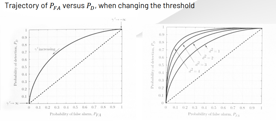 For the mean shifted Gaussian problem,T ∼ { N ( μ 0 , σ 2 ) , under H 0 N ( μ 1 , σ 2 ) , under H 1 → d 2 = ( μ 1 − μ 0 ) 2 σ 2 P D = Q ( Q − 1 ( P F A ) − d 2 ) T \sim \begin{cases} \mathcal{N}(\mu_0, \sigma^2), & \text{under } \mathcal{H}_0 \\[0.2cm] \mathcal{N}(\mu_1, \sigma^2), & \text{under } \mathcal{H}_1 \end{cases} \quad \rightarrow \quad d^2 = \frac{(\mu_1 - \mu_0)^2}{\sigma^2} \\[0.2cm] P_D = Q\left(Q^{-1}(P_{FA}) - \sqrt{d^2}\right) T ∼ ⎩ ⎪ ⎨ ⎪ ⎧ N ( μ 0 , σ 2 ) , N ( μ 1 , σ 2 ) , under H 0 under H 1 → d 2 = σ 2 ( μ 1 − μ 0 ) 2 P D = Q ( Q − 1 ( P F A ) − d 2 )
