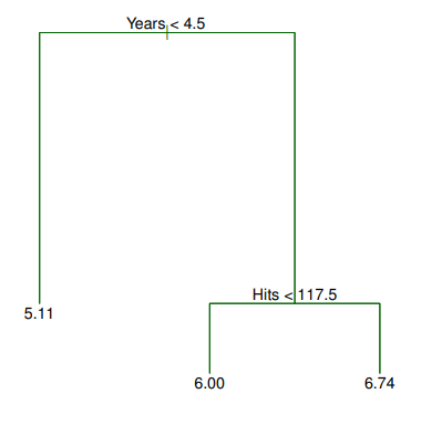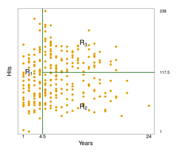 tree analogy, the regions , and are known as terminal nodesDecision trees are typically drawn upside down, in the sense that the leaves are at the bottom of the tereinternal nodesinternal nodes are indicated by the textregression model, it is easy to display, interpret and explainpredictor space - that is, the set of possible values for - into distinct and non-overlapping regions high-dimensional rectangls, or boxes, for simplicity and for ease of interpretation of the resulting predictive modelminimizes the RSS, given bytop-down, greedy approach that is known as recursive binary splittingtop-down because it begins at the top of the tree and then successively splits the predictor spacegreedy because at each step of the tree-building process, the best split is made at the particular step, rather than looking ahead and picking a split that will lead to a better tree in some future stepRSSbest predictor and best cutpoint in order to split the data further so as to minimize the RSS within each of the resulting regionsminimize the RSS. The process continues until a stopping criterion is reachedFor instance, we may continue until no region contains more than five observations