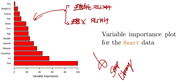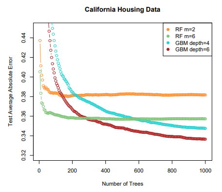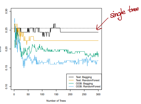 test error (black and orange) is shown as a function of , the number of bootstrapped training sets usedRandom forests were applied with single classificaion treeOOB error, which in this case is considerably lowerbagged modelbagging is that trees are repeatedly fit to bootstrapped subsets of the observationsaverage, each bagged tree makes use of around two-thirds of the observationsone-third of the observations not used to fit a given bagged tree and referred to as the out-of-bag (OOB) observationsOOBaverageLOO cross-validation error for bagging, if is largeRandom forests provide an improvement over bagged trees by way of a small tweak that decorrelates the treesvariance when we average the treesbagging, we build a number of decision trees on bootstrapped training samplesdecision trees, each time a split in a tree is considered, a random selection of predictors is chosen as split candidates from the full set of predictorspredictors considered at each split is approximately equal to the square root of the total number of prdictorsbagging, boosting is a general approach that can be applied to many statistical learning methods for regression or classificationboosting for decision treesbagging involves creating multiple copies of the original training data set using the bootstrap, fitting a seperate decision tree to each copy, and then combining all of the trees in order to create a single predictive modelbootstrap data set, independent of the other treesBoosting works in a similar way, except that the trees are grown sequentiallyterminal nodes to the training data shrunken version of the new tree :boosted modelfitting the data hard and potentially overfitting, the boosting approach instead learns slowlydecision tree into the fitted function in order to update the residualssmall, with just a few terminal nodes, determined by the parameter in the algorithmfitting small trees to the residuals, we slowly improve in areas where it does not perform wellshrinkage parameter slows the process down even further, allowing more and different shaped trees to attack the residualsBoosting for classification is similar in spirit to boosting for regression, but is a bit more complexnumber of trees bagging and random forests, boosting can overfit if is too large, although this overfitting tends to occur slowly if at all. We use cross-validation to select shrinkage parameter boosting learns. Typical values are 0.01 or 0.001, and the right choice can depend on the problem.number of splits complexity of the boosted ensemblestump, consisting of a sinple split and resulting in an additive model.interaction depth, and controls the interaction order of the boosted model, since splits can involve at most variables