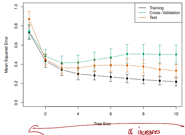 better strategy is to grow a very large tree , and then prune it back in order to obtain a subtreeCost complexity pruning - also known as weakest link pruning - is used to do thisnonnegative tuning parameter subtree such thatRSS : Terminal Node : terminal nodes of the Tree is the rectangle(i.e. the subset of predictor space) corresponding to the th terminal node, and is the mean of the trainin observations in trade-off between the subtree's complexity and its fit to the training dataoptimal value using cross-validationrecursive binary splitting to grow a large tree on the training data, stopping only when each terminal node has fewer than some minimum number of observationscomplexity pruning to the large tree in order to obtain a sequence of best subtrees, as a function of cross-validation to choose . For each mean squared prediction error on the data in the left-out th fold, as a function of subtree from Step 2 that corresponds to the chosen value of