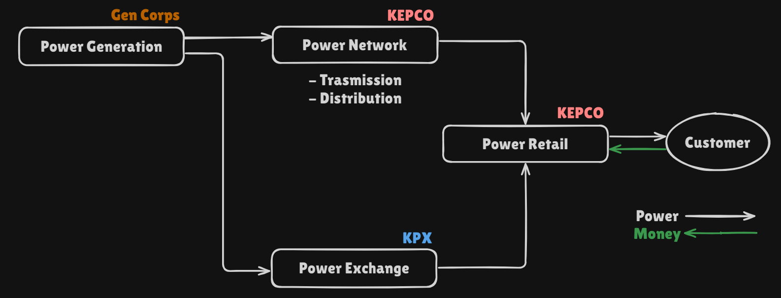 Gen Corps, Transmitted and distributed by KEPCO and also retailed to the customer by KEPCOKPX exchanges power between power gen corps and power demands.