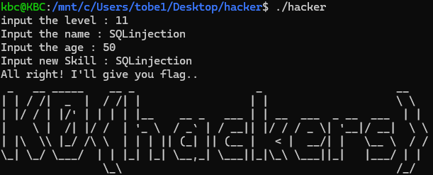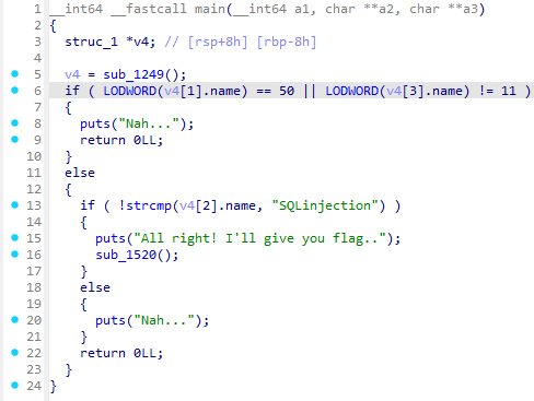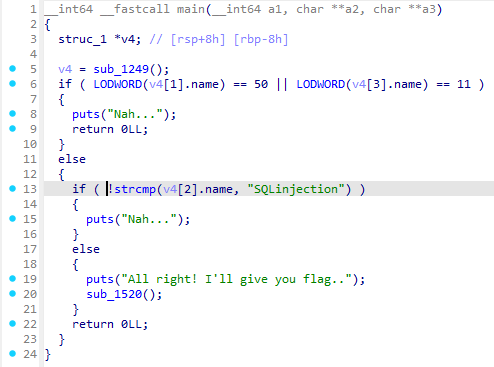 첫번째 요소가 50이고, 세번째 요소가 11이고, 두번째 요소가 "SQLinjection"이면 flag를 준다.