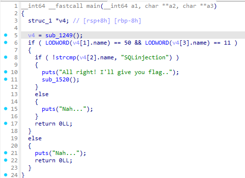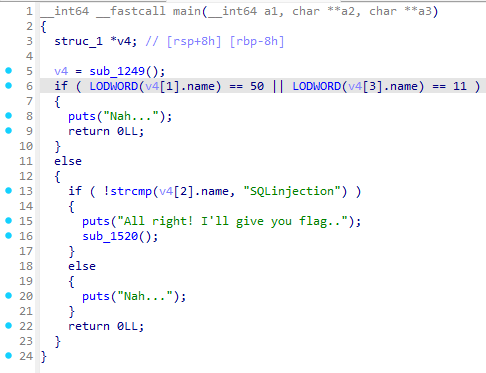main function은 sub_1249를 통해 v4에 저장하고 특정 로직을 통해 flag값을 주는 모양이다