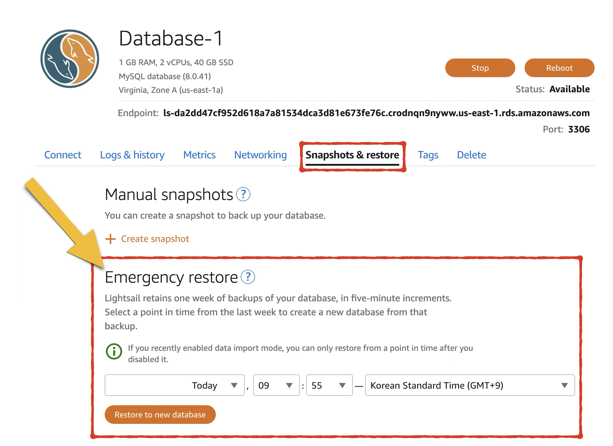 Emergency Restore를 사용하면 기존에 사용중인 Lightsail Database를 새로운 Lightsail Database로 복원할 수 있습니다.