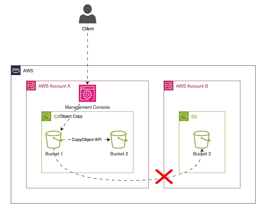 Object Copy 작업을 수행하려는 자격증명(예: IAM User, IAM Role)은 s3:GetObject, s3:PutObject 권한이 필요하며, 추가로 설정 상황에 따라서 s3:PutObjectAcl, s3:GetObjectTagging, s3:PutObjectTagging 등의 권한이 필요할 수 있습니다.