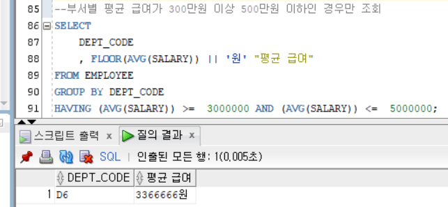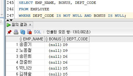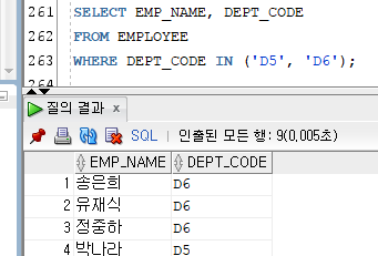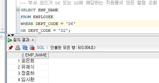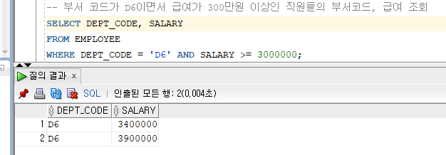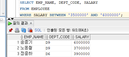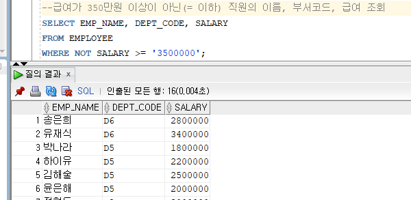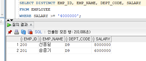 대소 비교 : >, <, > >=, <= 동등 비교 : = 같지 않다 : !=, ^=, <>Ex) SELECT DISTINCT EMP_ID, EMP_NAME, DEPT_CODE, SALARY