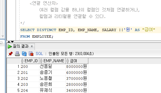 여러 컬럼 값을 하나의 컬럼인 것처럼 연결하거나, 칼럼과 리터럴을 연결할 수 있다.Ex) SELECT DISTINCT EMP_ID, EMP_NAME, SALARY ||'원' AS "급여"