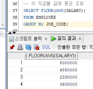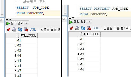 여러개 칼럼을 대상으로 하면 모든 칼럼값이 중복되어야 제거한다.Ex) SELECT DISTINCT JOB_CODE
