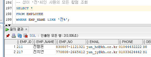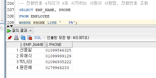 - 비교대상칼럼 LIKE '문자%' = 비교대상칼럼 값 중에 '문자'로 시작하는 모든 행을 조회한다.