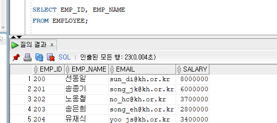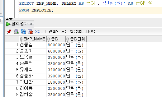 리터럴은 RESULT SET의 모든 행에 반복적으로 출력된다.Ex) SELECT EMP_NAME, SALARY AS 급여 , '단위(원)' AS 급여단위