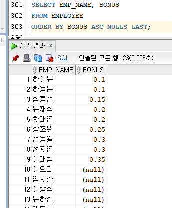 - NULLS LAST : 정렬하고자 하는 칼럼 값에 NULL이 있는 경우 해당 데이터 값을 맨 뒤로 정렬한다.