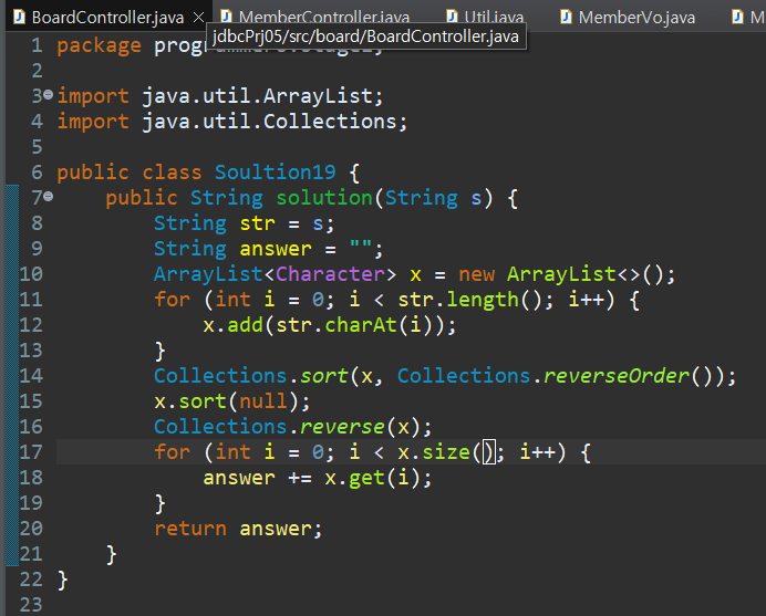 문제 설명 : 문자열 s에 나타나는 문자를 큰것부터 작은 순으로 정렬해 새로운 문자열을 리턴하는 함수, solution을 완성해주세요. s는 영문 대소문자로만 구성되어 있으며, 대문자는 소문자보다 작은 것으로 간주합니다.
