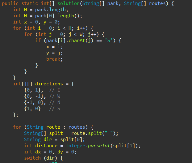 공원의 가로 길이가 W, 세로 길이가 H라고 할 때, 공원의 좌측 상단의 좌표는 (0, 0), 우측 하단의 좌표는 (H - 1, W - 1) 입니다.공원을 나타내는 문자열 배열 park, 로봇 강아지가 수행할 명령이 담긴 문자열 배열 routes가 매개변수로 주어질 때, 로봇 강아지가 모든 명령을 수행 후 놓인 위치를 [세로 방향 좌표, 가로 방향 좌표] 순으로 배열에 담아 return 하도록 solution 함수를 완성해주세요.