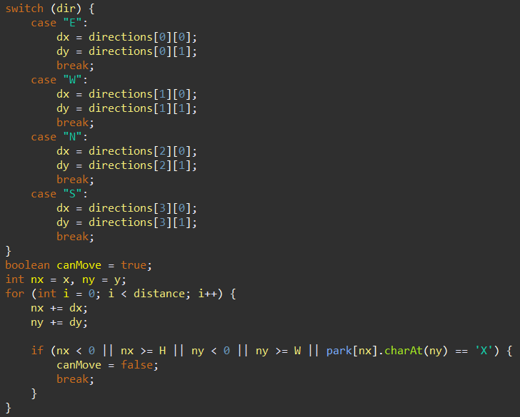 예를 들어 "E 5"는 로봇 강아지가 현재 위치에서 동쪽으로 5칸 이동했다는 의미입니다. 로봇 강아지는 명령을 수행하기 전에 다음 두 가지를 먼저 확인합니다.주어진 방향으로 이동할 때 공원을 벗어나는지 확인합니다.