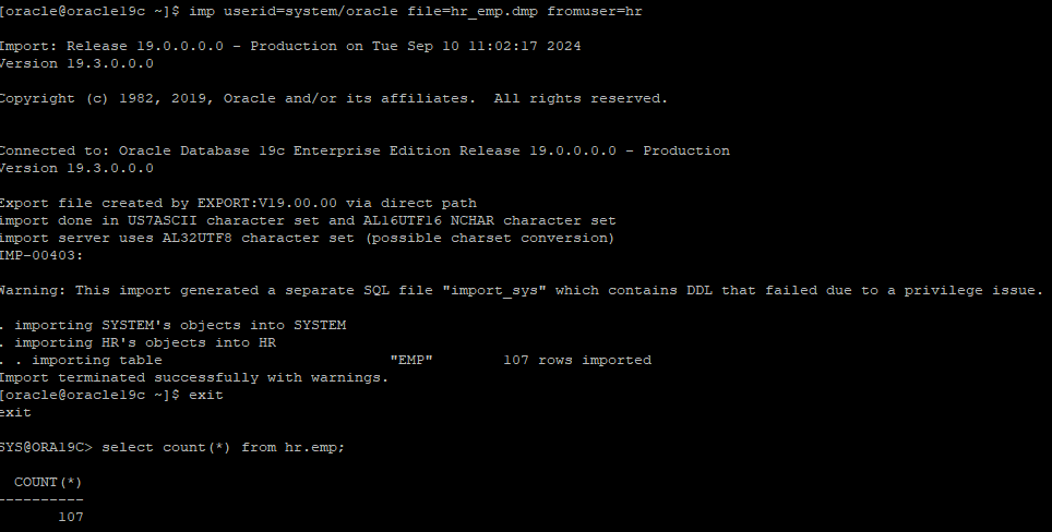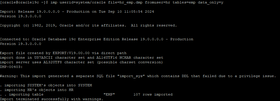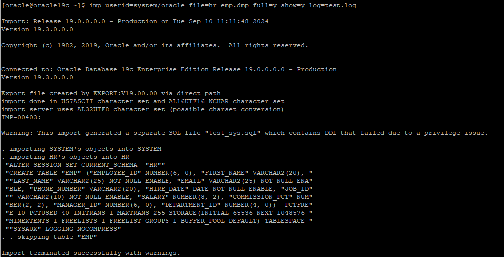 imp userid=system/oracle file=ora19c_full.dmp fromuser=hr tables=employees