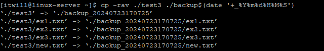 # cp -rv ./test3 ./test4 : test4라는 디렉터리를 만들면서 test3 디렉터리 내용 복사