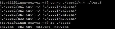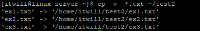 # cp -v *.txt ~/test2 : test2 디렉터리에 전체 txt 파일을 복사하는 화면 출력