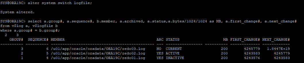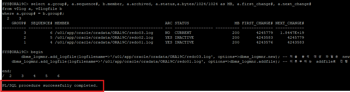 dbms_logmnr.add_logfile(logfilename=>'/u01/app/oracle/oradata/ORA19C/redo02.log', options=>dbms_logmnr.addfile); -- 이후부터는 addfile로 진행