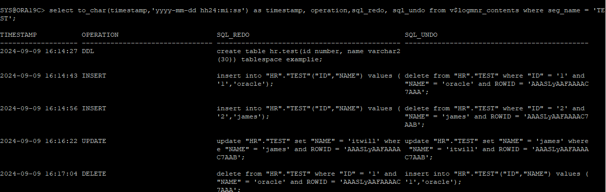 select to_char(timestamp,'yyyy-mm-dd hh24:mi:ss') as timestamp, operation,sql_redo, sql_undo from v$logmnr_contents where seg_name = 'TEST';
